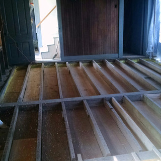 Having gutted the former summer kitchen back to the studs, Rick prepped the sub-floor area with strips of plywood to create an envelope for the foam insulation. When set, we called Berkshire Spray Foam to spray the sub-floor to both insulate the floor and lock in the floor joists. The foam, once sprayed down, dries like concrete and makes for an incredibly dense support system. You can walk on it after an hour! Rick & I laid down 5/8" plywood as the new sub-floor. At this stage the summer kitchen is essentially an empty 16' x 22' area but we have plans to fill it up.